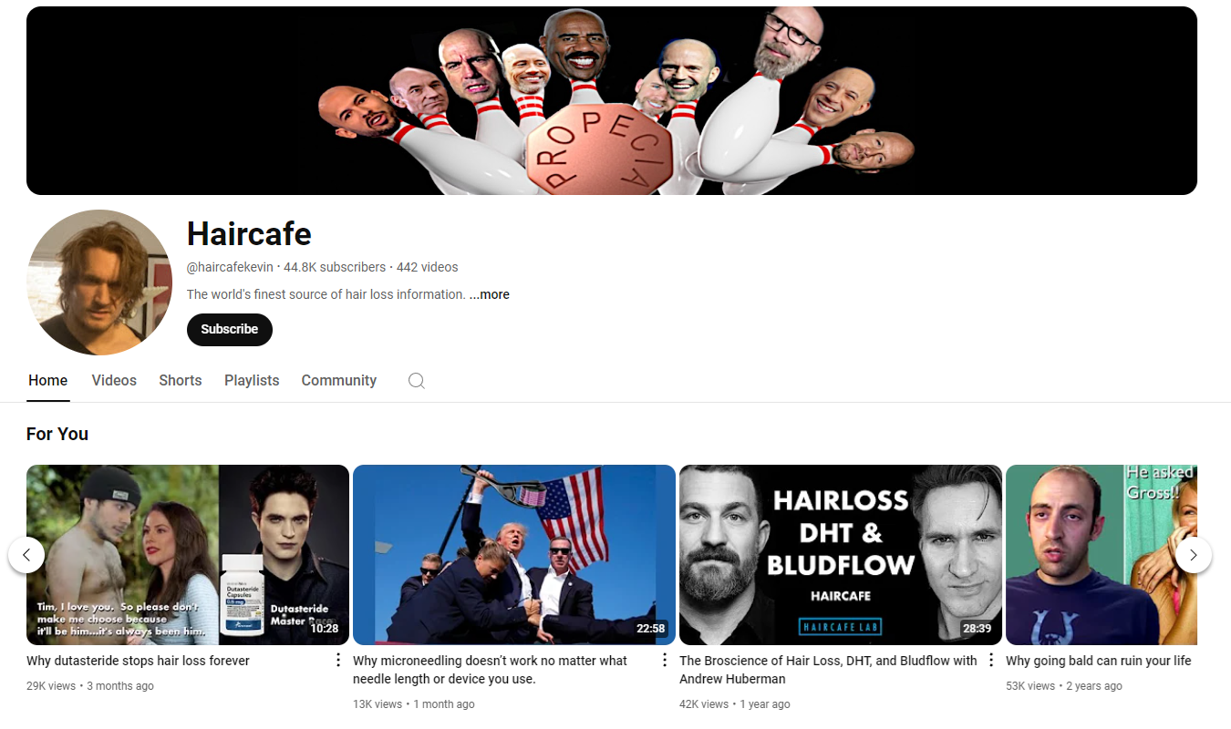 Kevin Mann is currently best known for his Youtube channel Haircafe. Self-proclaimed as “the world's finest source of hair loss information,” this channel currently features over 400 videos and 44k subscribers. Its content ranges from Mann’s own daily hair loss routine to the latest medical news in the field.