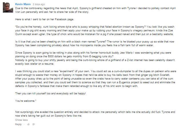It became public knowledge that Von Lon had cheated on Antwiler during their relationship, with an unsubstantiated rumor that she had been involved with an African-American man named Tyrone. Despite having no connection to either party, Kevin Mann felt compelled to “politely” confront Von Lon with a long and vulgar Facebook message filled with racist, homophobic, and misogynistic language. His message is a barrage of insults that ends with an encouragement of suicide towards Von Lon. Afterward, Mann proudly reposted the entirety of this message on his own Facebook page, which can be viewed above.