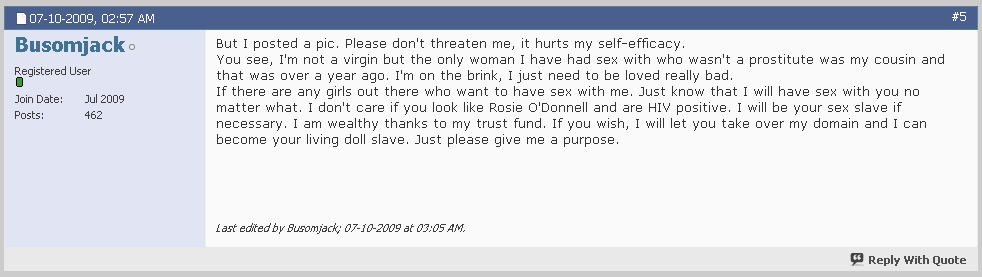 These examples are only the tip of the iceberg of his activity on Ebaumsworld. His presence on this forum included hundreds of posts, many of which involved him desperately begging its members for friendship and looking for potential sex partners.
