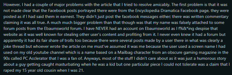 Later in a Reddit post under the handle Rider_Of_Roach on the Tressless subreddit, Kevin Mann would contradict this statement about having his account hacked, and claim that he didn’t even know that Ebaumsworld had a forum and never had an account: