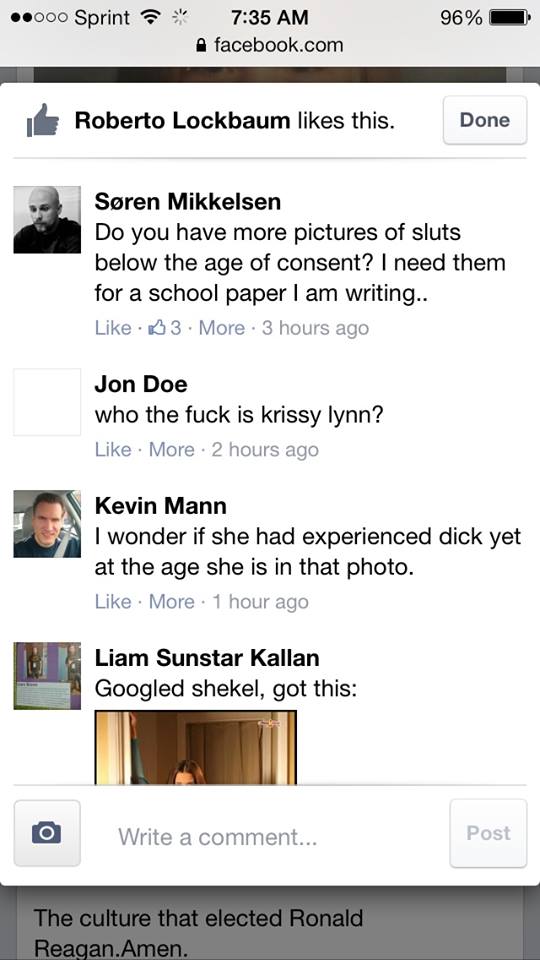In the comments under this post, Kevin Mann can be seen lurking and speculating whether the child in the photo had experienced any penetrative sex at the age in which the picture was taken. His disturbing reply can be seen here: