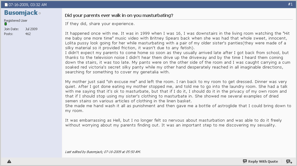 In the post screencapped above, Kevin Mann shares a memory of frequently masturbating with his older sister’s underwear, and how he was eventually caught by his mother. Rather than express any shame or regret about this, Kevin Mann seems to view the experience fondly as a step in his sexual self-discovery. He also denied that this activity was fueled by any incest fetishization on his part.