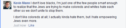 In the past, Kevin Mann has been known to take to his social media to make unprovoked racial statements. One of the most infamous examples can be seen below, where Mann declared on Facebook that while he “hate(s)” people of color, he chooses to withhold his hostility because he is against “empowering the Jews” more than anything else.