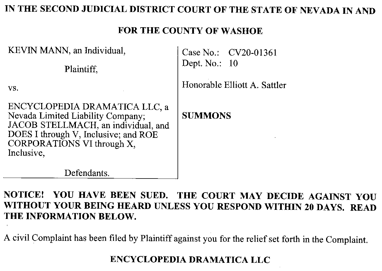 Mann is notoriously litigious about his unsavory past, and has been known to issue defamation lawsuits to silence anybody who tries to publicly document or expose any of it. This includes the lawsuit Kevin Mann v. Encyclopedia Dramatica LLC, et al, which he filed against several entities in 2020.