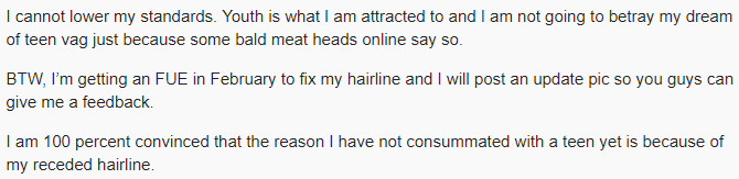 For instance, on the T-Nation forums he was known to publicly lust over teenage women. He talked about his ultimate goal of having sex with them, which he believed that his hairless was preventing: