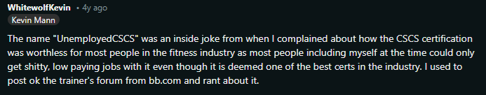 Another username that Kevin Mann was known for is UnemployedCSCS, which he used for the BodyBuilding.com and T-Nation forums. Mann has confirmed that this was him, and that the name was an “inside joke” from when he worked in the fitness industry: